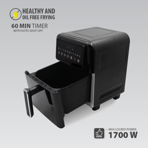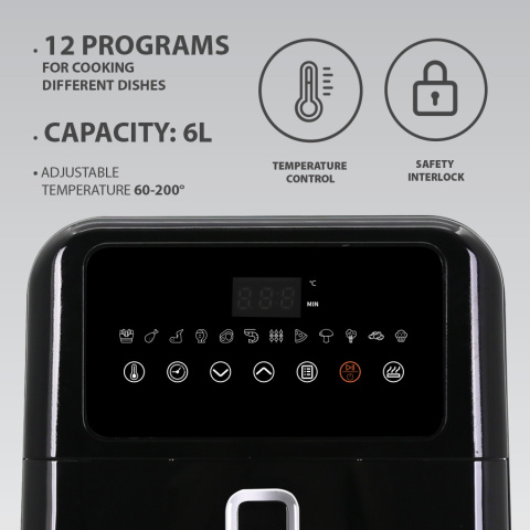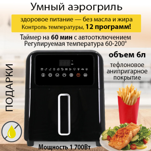 Обьём: 6 л, 220-240 В, ~ 50 Гц, 1500-1700 Вт, Позволяет приготовить блюда без масла и жира, Ёмкость для приготовления с тефлоновым антипригарным покрытием, Электронное управление. Решетка-гриль 12 программ приготовления различных блюд. Регулируемая температура 60-200°. Таймер на 60 мин с автоотключением
