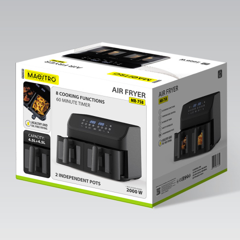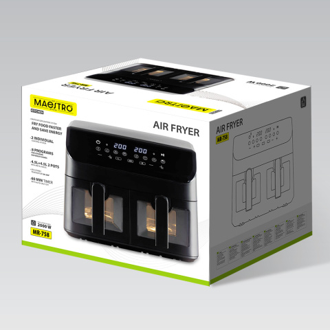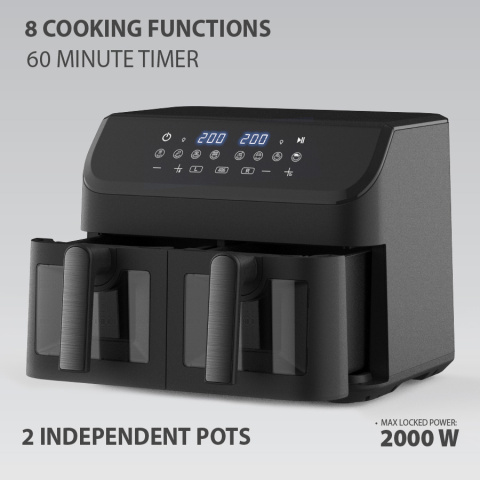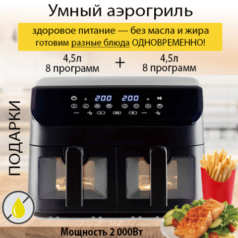 2 чаши объемом 4,5 л + 4,5 л с металлическими решетками, 220-240 В, ~ 50 Гц, 1800-2000 Вт, Система быстрой циркуляции воздуха позволяет быстрее жарить продукты и экономить энергию, Антипригарное покрытие чаши, 2 индивидуальные системы управления, Функция защиты от перегрева. Не нагревающиеся корпус и ручка. 8 программ приготовления различных блюд. Регулируемая температура 80°C-200°C. Таймер автоматического отключения на 30 минут