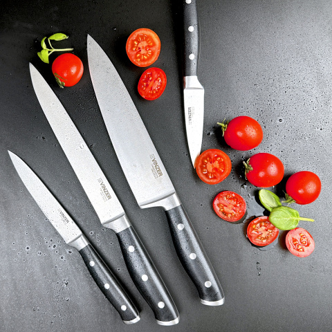 Универсальный японский нож Сантоку с широким и коротким лезвием легко и быстро справится с нарезкой любых продуктов. Лезвие изготовлено из высокоуглеродистой стали. Рукоятка удобно ложится в руку и способствует эффективной и безопасной работе. Клинок имеет клинообразное сечение, поэтому лезвие долгое время не требует заточки. Ухаживать за ножом очень просто — можно мыть вручную и в посудомоечной машине.