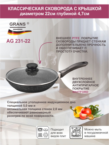 Сковорода с крышкой диаметром 22см глубиной 4,7см с внутренним двухслойным антипригарным покрытием Whitford.