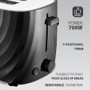 Мощность: 220-240 В, ~50 Гц, 700 Вт.Эргономичный дизайн.Не нагревающийся корпус.Возможность поджаривания толстых ломтиков хлеба. Семипозиционный таймер. Функция отмены. Съемный поддон для крошек. Цвета: черный.